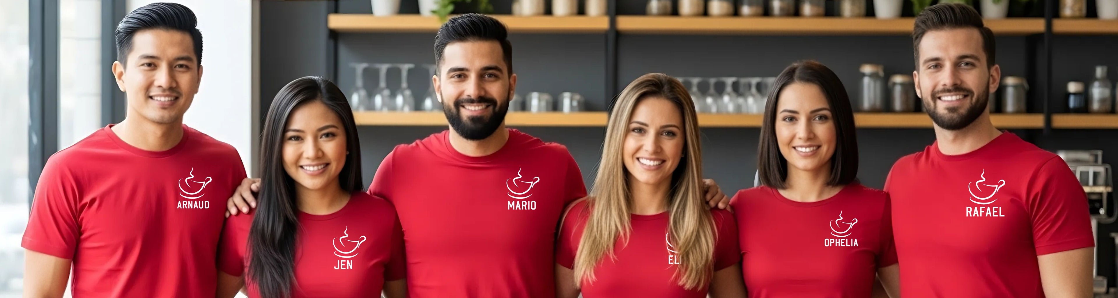 Now, everyone can each have a shirt in their size, featuring the same design or logo, but personalized with their name! Great for restaurants, warehouses, construction crews -- or bachelorette parties and family get-togethers!